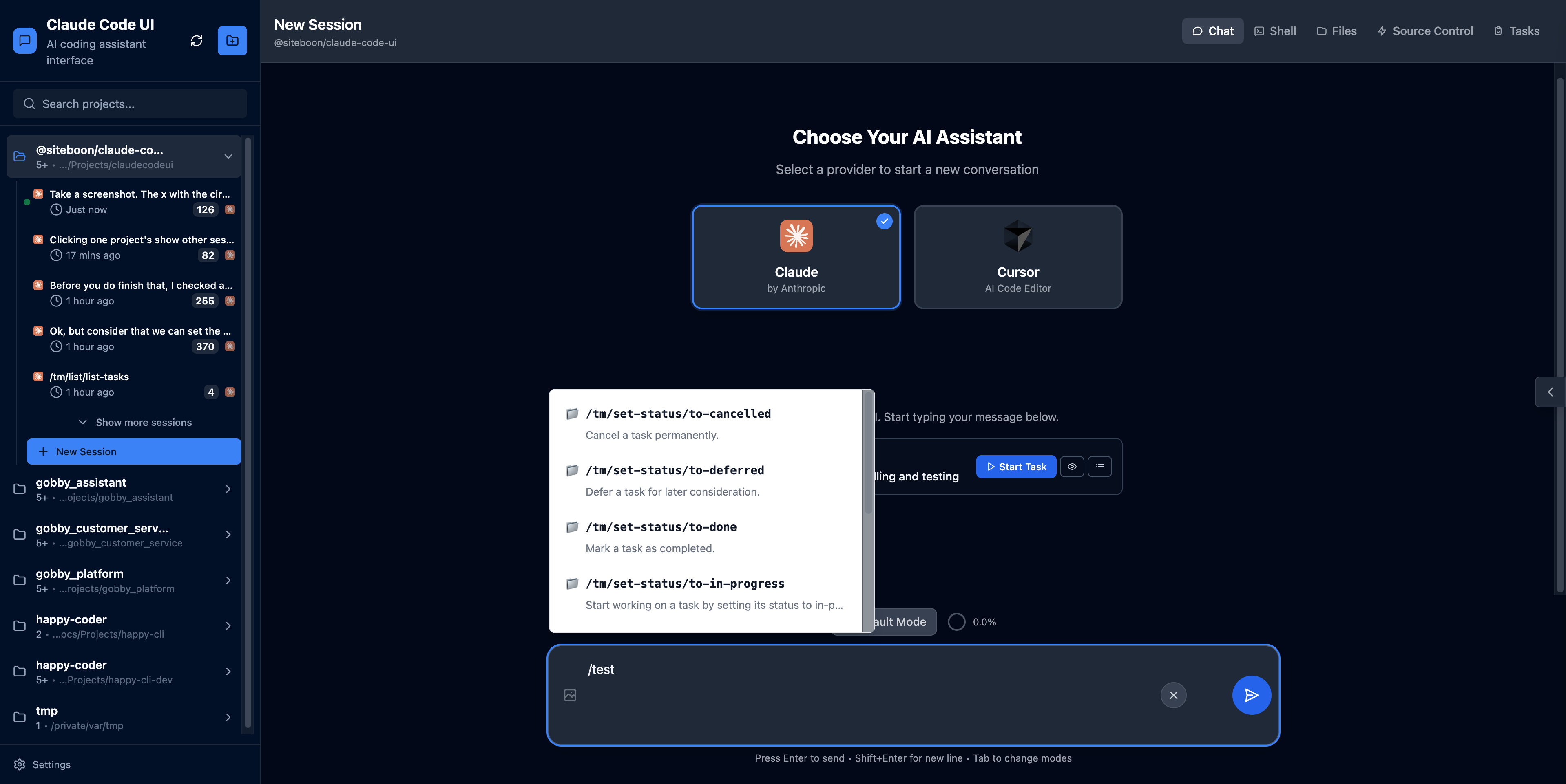 * feat: Add token budget tracking and multiple improvements ## Features - **Token Budget Visualization**: Added real-time token usage tracking with pie chart display showing percentage used (blue < 50%, orange < 75%, red ≥ 75%) - **Show Thinking Toggle**: Added quick settings option to show/hide reasoning sections in messages - **Cache Clearing Utility**: Added `/clear-cache.html` page for clearing service workers, caches, and storage ## Improvements - **Package Upgrades**: Migrated from deprecated `xterm` to `@xterm/*` scoped packages - **Testing Setup**: Added Playwright for end-to-end testing - **Build Optimization**: Implemented code splitting for React, CodeMirror, and XTerm vendors to improve initial load time - **Deployment Scripts**: Added `scripts/start.sh` and `scripts/stop.sh` for cleaner server management with automatic port conflict resolution - **Vite Update**: Upgraded Vite from 7.0.5 to 7.1.8 ## Bug Fixes - Fixed static file serving to properly handle routes vs assets - Fixed session state reset to preserve token budget on initial load - Updated default Vite dev server port to 5173 (Vite's standard) ## Technical Details - Token budget is parsed from Claude CLI `modelUsage` field in result messages - Budget updates are sent via WebSocket as `token-budget` events - Calculation includes input, output, cache read, and cache creation tokens - Token budget state persists during active sessions but resets on session switch * feat: Add session processing state persistence Fixes issue where "Thinking..." banner and stop button disappear when switching between sessions. Users can now navigate freely while Claude is processing without losing the ability to monitor or stop the session. Features: - Processing state tracked in processingSessions Set (App.jsx) - Backend session status queries via check-session-status WebSocket message - UI state (banner + stop button) restored when returning to processing sessions - Works after page reload by querying backend's authoritative process maps - Proper cleanup when sessions complete in background Backend Changes: - Added sessionId to claude-complete, cursor-result, session-aborted messages - Exported isClaudeSessionActive, isCursorSessionActive helper functions - Exported getActiveClaudeSessions, getActiveCursorSessions for status queries - Added check-session-status and get-active-sessions WebSocket handlers Frontend Changes: - processingSessions state tracking in App.jsx - onSessionProcessing/onSessionNotProcessing callbacks - Session status check on session load and switch - Completion handlers only update UI if message is for current session - Always clean up processing state regardless of which session is active * feat: Make context window size configurable via environment variables Removes hardcoded 160k token limit and makes it configurable through environment variables. This allows easier adjustment for different Claude models or use cases. Changes: - Added CONTEXT_WINDOW env var for backend (default: 160000) - Added VITE_CONTEXT_WINDOW env var for frontend (default: 160000) - Updated .env.example with documentation - Replaced hardcoded values in token usage calculations - Replaced hardcoded values in pie chart display Why 160k? Claude Code reserves ~40k tokens for auto-compact feature, leaving 160k available for actual usage from the 200k context window. * fix: Decode HTML entities in chat message display HTML entities like < and > were showing as-is instead of being decoded to < and > characters. Added decodeHtmlEntities helper function to properly display angle brackets and other special characters. Applied to: - Regular message content - Streaming content deltas - Session history loading - Both string and array content types * refactor: Align package.json with main branch standards - Revert to main branch's package.json scripts structure - Remove custom scripts/start.sh and scripts/stop.sh - Update xterm dependencies to scoped @xterm packages (required for code compatibility) - Replace xterm with @xterm/xterm - Replace xterm-addon-fit with @xterm/addon-fit 🤖 Generated with [Claude Code](https://claude.com/claude-code) Co-Authored-By: Claude <noreply@anthropic.com> * feat: Replace CLI implementation with Claude Agents SDK This commit completes the migration to the Claude Agents SDK, removing the legacy CLI-based implementation and making the SDK the exclusive integration method. Changes: - Remove claude-cli.js legacy implementation - Add claude-sdk.js with full SDK integration - Remove CLAUDE_USE_SDK feature flag (SDK is now always used) - Update server/index.js to use SDK functions directly - Add .serena/ to .gitignore for AI assistant cache Benefits: - Better performance (no child process overhead) - Native session management with interrupt support - Cleaner codebase without CLI/SDK branching - Full feature parity with previous CLI implementation - Maintains compatibility with Cursor integration 🤖 Generated with [Claude Code](https://claude.com/claude-code) Co-Authored-By: Claude <noreply@anthropic.com> * Update server/claude-sdk.js Whoops. This is correct. Co-authored-by: coderabbitai[bot] <136622811+coderabbitai[bot]@users.noreply.github.com> * Update server/index.js Co-authored-by: coderabbitai[bot] <136622811+coderabbitai[bot]@users.noreply.github.com> * Update src/components/ChatInterface.jsx Co-authored-by: coderabbitai[bot] <136622811+coderabbitai[bot]@users.noreply.github.com> * Update src/components/ChatInterface.jsx Co-authored-by: coderabbitai[bot] <136622811+coderabbitai[bot]@users.noreply.github.com> * Update src/components/ChatInterface.jsx Left my test code in, but that's fixed. Co-authored-by: coderabbitai[bot] <136622811+coderabbitai[bot]@users.noreply.github.com> * fix: Prevent stale token-usage data from updating state on session switch - Add AbortController to cancel in-flight token-usage requests when session/project changes - Capture session/project IDs before fetch and verify they match before updat